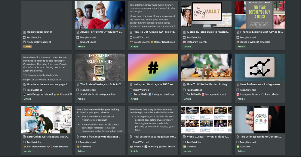 For each Library Item, there is a checkbox for whether I have watched or read it yet. This helps me keep track of what content I've consumed or not. I created another linked instance of the Library database that's filtered to only show items that need to be read or watched. This allows me to have a queue of content I need to go through to keep productive.